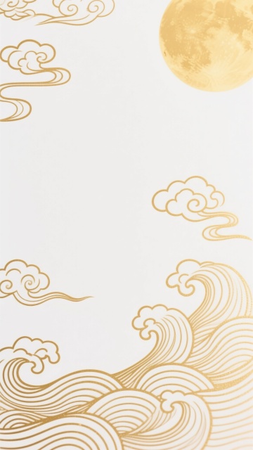 一幅具有浓郁中秋氛围的中国传统纹样设计图,画面以大面积留白为背景,主体为流畅飘逸的金色祥云与海浪纹样,线条细腻优美,呈对称式构图分布于画面一侧。暖色调的金色线条在白色背景上形成鲜明对比,营造出典雅、祥和且富有节日气息的氛围,整体风格简约而不失精致,具有浓厚的东方美学韵味和传统节日的喜庆感。