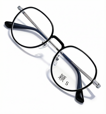 简约现代风格,纯白色纯背景,单一元素规整排布,一副黑色上框与银色金属下框拼接的方形双梁眼镜,镜片透明,金属铰链细节清晰,黑色镜脚,无文字,无logo,无水印,高清晰度,产品展示角度,光线均匀柔和,阴影浅淡自然。