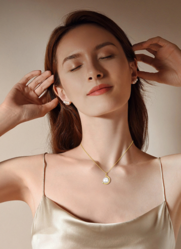 高清晰度商业人像摄影,柔和明亮的光线,细腻自然的肤色质感,棕色长卷发自然垂落,部分发丝轻盈飘动,身着浅米色简约吊带,佩戴金色细圈耳环和金色细手镯,半身构图,女性侧身站立,一手轻抚颈部,另一手自然下垂,眼神温柔望向镜头,背景为纯白色,整体呈现清新、优雅、纯净的氛围,画面简洁干净,突出人物主体。