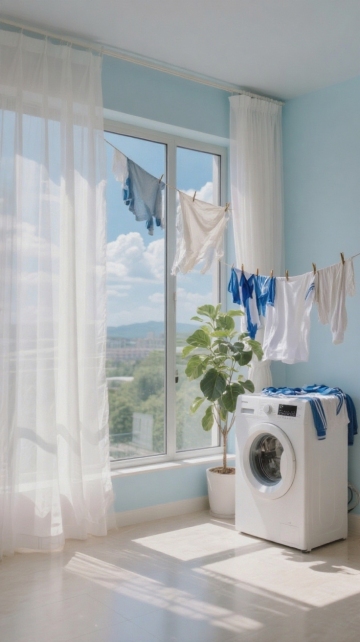 俯视角构图,极简未来主义风格的白色滚筒洗衣机悬浮于无限延伸的半透明亚克力平台中央,机身采用纳米级哑光白陶瓷材质,正面360度环绕式无边框全息观察窗正投射出流动的蓝色智能洗涤数据光效,窗沿镶嵌0.3mm超细钛合金边框形成精密的视觉分割。控制面板区域采用隐形触控技术,在通电状态下呈现冰蓝色LED虚拟按键阵列,中央旋钮带有钻石切割纹理并发出柔和的呼吸光。侧面的竖直线条采用激光雕刻的微米级凹槽,在45度侧光照射下形成精密的光影韵律。底部抽屉面板集成压力感应式开启装置,边缘倒角精确到0.5mm。环境采用4K超高清商业摄影标准布光,主光源来自左上方45度角的柔光箱,右侧配置补光灯消除阴影,背景为渐变的珍珠白到浅灰的渐变,底部铺设反光亚克力板形成微妙倒影,整体呈现出医疗级的洁净感与航天工程般的精密美学。