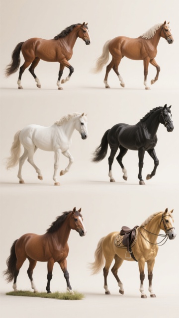 以细腻流畅的钢笔手绘线条风格,在浅色背景上,上下两行对齐排列六个不同样式、不同材质、不同动作的马造型。每个马的轮廓清晰,线条富有动感和力量感,通过线条的粗细变化和疏密对比表现出马的肌肉结构、鬃毛和尾巴的飘逸感,以及不同材质的质感差异。整体构图简洁明快,确保每个马的姿态独特且生动,保持一致的手绘艺术风格和视觉统一性。