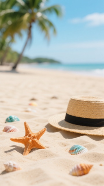俯瞰视角,金色的沙滩如同融化的蜂蜜在阳光下流淌,被海水切割出蜿蜒的银色边界,一只半埋在沙中的蓝白条纹沙滩球正被退潮的细浪轻轻亲吻,旁边散落着几颗珍珠母贝和淡粉色贝壳,远处海面上悬浮着几座被翠绿植被覆盖的小岛,如同漂浮在玻璃上的翡翠,天空被分成明亮的蔚蓝与蓬松的积云两部分,一只海鸥展开翅膀掠过云层投下的阴影,画面右侧垂下几片带着露珠的椰子树叶,阳光透过叶隙在沙滩上形成斑驳的光斑,海水呈现由浅至深的多层蓝绿色,近处可见细小的白色浪花轻抚沙滩,远处海天相接处泛着柔和的金光,整体色调明亮通透,充满慵懒惬意的夏日午后氛围。