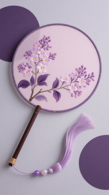 一把精美的中国传统刺绣团扇,扇面呈优雅的花瓣形,边缘有精致的绿色包边。扇面上绣着栩栩如生的玉兰花枝,白色玉兰花点缀着淡黄色花蕊,绿色的枝叶舒展自然。扇柄为深棕色,末端装饰有绿色的流苏,流苏上串有小巧的珠子。背景是淡蓝色和深蓝色的渐变圆形色块,营造出宁静雅致的氛围,整体呈现出细腻的工笔画风格,光影柔和,立体感强,具有浓厚的东方美学韵味。