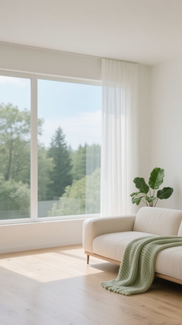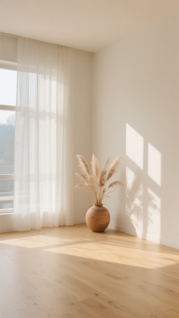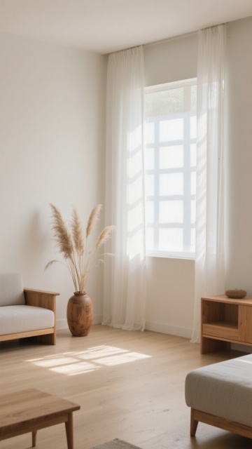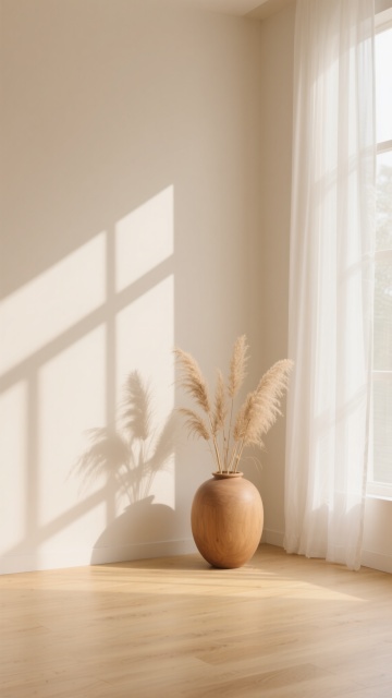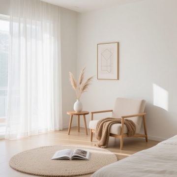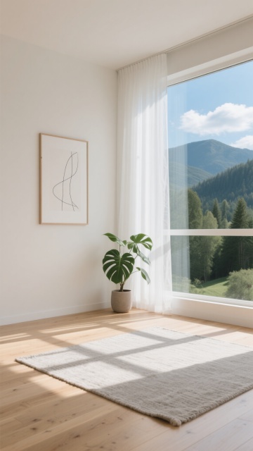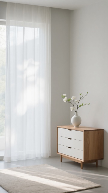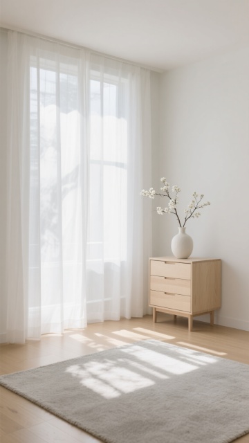 超写实3D渲染的卧室室内场景,采用极简主义北欧风格设计,整体以纯净的白色、原木色和浅灰色为基调,营造出明亮通透、宁静舒适的氛围。阳光透过白色半透明窗帘从一侧窗户洒落,在浅色木地板上形成清晰柔和的光影条纹,光线明亮柔和,阴影细节丰富自然。房间内有一张木质床架配浅灰色床头板的双人床,铺着洁白平整的床单和枕头,床尾铺设一块浅灰色编织地毯。床的一侧是一个浅色木质床头柜,上面摆放着透明玻璃花瓶插着干花、黑色圆形小摆件和细长的金属台灯,下方抽屉里整齐排列着几本精装书籍。房间另一侧有大型绿色植物增添生机,地面干净整洁,墙面为纯白色,整体构图简约对称,空间感开阔,材质表现细腻真实,木纹、布料纹理和光影过渡自然。不同角度展示房间内的家具摆设,包括更换床的朝向、调整床头柜和植物的位置,尝试浅蓝、米黄、浅绿等不同柔和配色方案的墙面与软装,保持相同的极简风格、光影质感和舒适氛围。