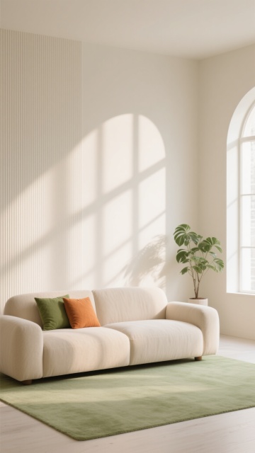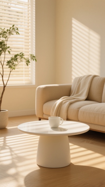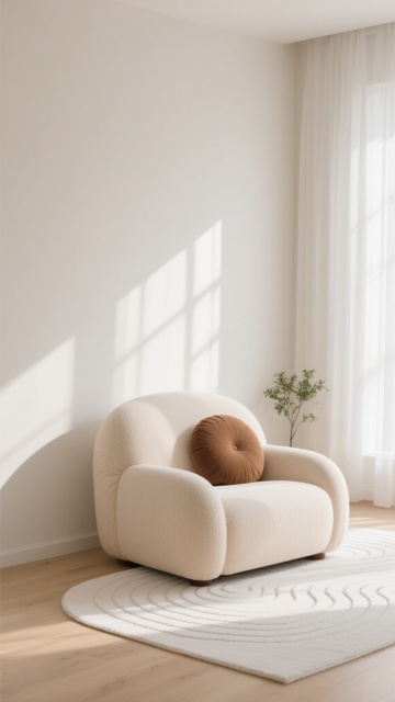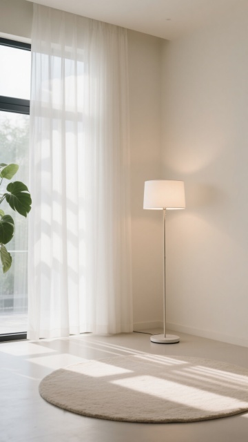 极简主义室内背景,画面中央是一块特写的圆形米白色地毯,质地柔软带有细腻纹理,边缘有精致收边。房间以柔和的米色和浅卡其色为主色调,左侧是落地玻璃窗,覆盖着半透明的白色纱帘和厚重的米棕色遮光窗帘,窗外隐约可见绿色植物剪影。右侧墙角立着一盏现代简约风格的金色金属底座落地灯,圆形乳白色灯罩散发着温暖柔和的光线,在墙壁上形成渐变光影。整体采用自然光与室内灯光结合的照明,光线明亮柔和,地面和地毯上有清晰的窗户投影纹理。空间布局简洁空旷,线条干净利落,营造出宁静、舒适、高级感的氛围,视觉层次分明,信息传达直接,符合极简主义设计美学。