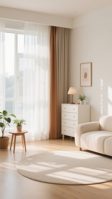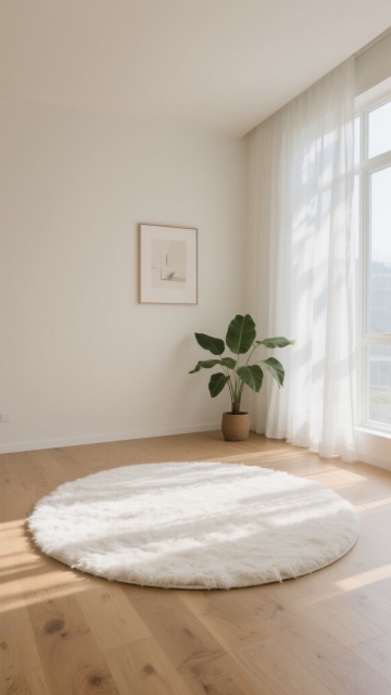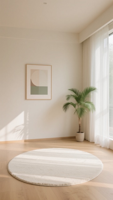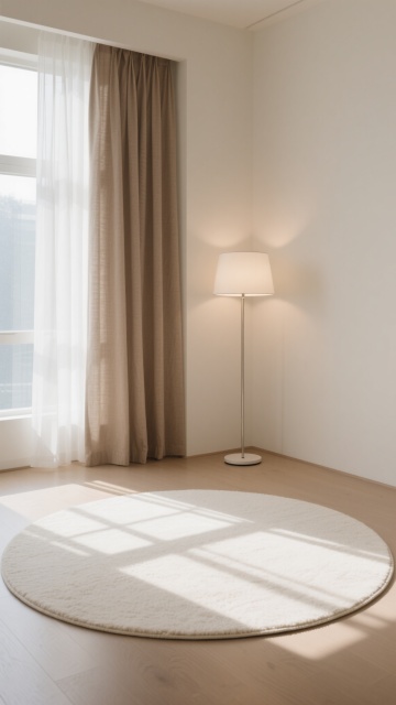 极简主义室内背景,画面中央是一块巨大的圆形米白色地毯特写,地毯表面有细腻的纹理质感,边缘有精致的收边设计。房间整体采用米白色和浅棕色的柔和色调,左侧是大面积的落地窗,挂着两层窗帘,内层是轻薄透光的白色纱帘,外层是厚实的浅棕色亚麻质感落地窗帘,窗帘自然垂坠,有明显的褶皱纹理。右侧墙角立着一盏现代简约风格的落地灯,灯罩是圆形的乳白色磨砂玻璃,金属灯杆纤细,底座为圆形,灯光柔和地照亮墙角,在墙壁上形成温暖的光晕。阳光透过纱帘洒入室内,在地板和地毯上投下窗格的阴影和窗帘的光影,整个空间光线明亮柔和,氛围宁静、舒适、整洁,具有高级的现代简约设计感,空间布局开阔,留白充足,视觉层次清晰,突出地毯的主体地位。