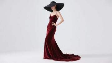 一位女性侧身站立,头戴宽大黑色礼帽,帽檐遮住面部,单手叉腰,姿态优雅。她身着一袭酒红色丝绒吊带长裙,裙摆呈鱼尾状自然垂落并拖曳于地,面料光泽柔和,褶皱层次丰富。整体画面为纯白色背景,光线明亮均匀,突出主体人物的优雅轮廓与服装的质感,营造出简约高级的时尚氛围。