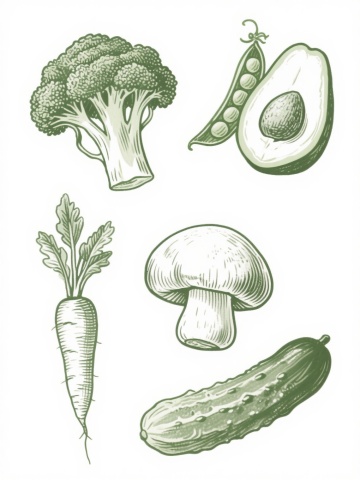 纯白背景上,以细腻流畅的单色绿色线条勾勒出六个完全不同类型的蔬菜,包括完整的西兰花、带藤蔓的豌豆荚、切开的牛油果(露出果核和果肉纹理)、连根带叶的胡萝卜、饱满的蘑菇(带菌褶细节)和长条形的黄瓜,所有蔬菜均保持手绘素描风格,形态写实且带有自然纹理,以不规则但均衡的布局规整排布成一个集合,线条清晰连贯,无其他装饰元素。