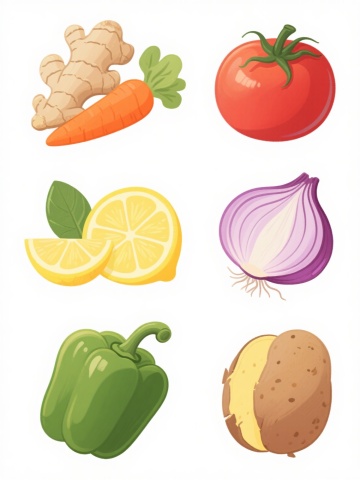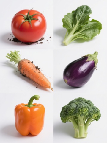 一张展示6种完全不同类型蔬菜的系列素材集合海报,采用超写实摄影风格,纯净的纯白色纯色背景,保持与原图一致的高清细节质感、明亮自然光线(光源来自左上方,产生柔和阴影)、鲜亮饱和的色彩还原(蔬菜本身的自然色彩,如翠绿、深绿、橙红、紫色等),以及清晰锐利的叶片纹理和表面光泽。6种蔬菜(例如:饱满的红番茄、带泥土的胡萝卜、紫色茄子、翠绿黄瓜、橙色甜椒、西兰花)被规整排布成两行三列的网格布局,每个蔬菜独立居中放置,大小统一,间距均匀,确保视觉上的平衡与秩序感。整体画面简洁干净,突出蔬菜的新鲜与自然,无任何文字、LOGO、二维码或多余装饰元素,信息传达直接高效,符合食品素材、健康饮食或生鲜产品宣传的设计目的,目标受众为食品设计师、餐饮从业者或注重健康饮食的消费者。