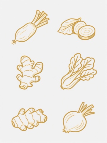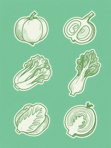 纯色背景,手绘线描风格,以绿色线条勾勒六个完全不同类型的蔬菜,包括完整形态和剖面细节,保持线条流畅细腻、轮廓清晰、细节丰富的特点,规整排布成集合素材,整体呈现简洁自然的插画感。