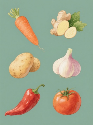一套四个不同蔬菜的系列图标,保持简洁的儿童插画风格,每个图标都有单一的纯色背景,整体色彩变换,元素类目保持为蔬菜,每个图标都有简单的线条和形状,以及高光和阴影的细节,图标排列整齐,形成一个规整的集合。第一个图标是橙色的胡萝卜,顶部有绿色的叶子;第二个图标是红色的番茄,带有绿色的叶子;第三个图标是黄色的南瓜,带有深绿色的条纹;第四个图标是紫色的茄子,带有绿色的茎。每个图标都有简洁的轮廓和填充,高光部分用浅色表示,阴影部分用深色线条表示,整体风格统一,色彩明快,适合作为儿童教育素材或食品相关的设计元素。