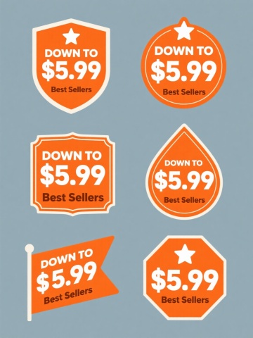 六个不同造型的橙色促销标签系列素材,保持纯色背景和统一风格,每个标签均包含"$5.99"折扣元素内容,造型分别为:1.盾牌形标签,顶部带白色五角星,中间白色"DOWN TO"字样,大号白色"$5.99"价格,底部棕色"Best Sellers"文字;2.圆形标签,顶部白色五角星,中间白色"DOWN TO",大号白色"$5.99",底部棕色"Best Sellers";3.方形切角标签,顶部白色五角星,中间白色"DOWN TO",大号白色"$5.99",底部棕色"Best Sellers";4.水滴形标签,顶部白色五角星,中间白色"DOWN TO",大号白色"$5.99",底部棕色"Best Sellers";5.旗帜形标签,顶部白色五角星,中间白色"DOWN TO",大号白色"$5.99",底部棕色"Best Sellers";6.六边形标签,顶部白色五角星,中间白色"DOWN TO",大号白色"$5.99",底部棕色"Best Sellers",所有标签规整排布成2行3列的系列集合。