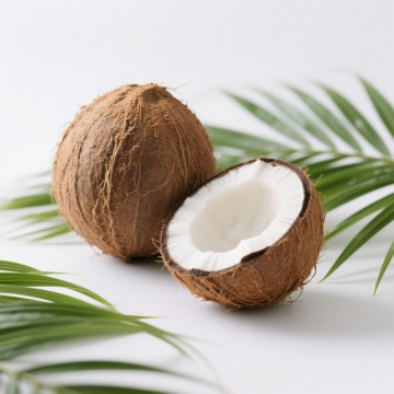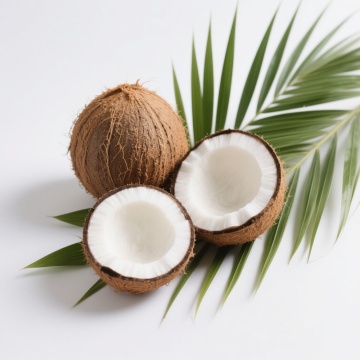 白底背景上,新鲜的椰子组合,一个完整的棕色带纹理的椰子和两个被切开的椰子,露出洁白厚实的椰肉,旁边点缀着几片长条形的绿色椰子叶,整体呈现出高清写实的摄影风格,光线明亮柔和,突出椰子的自然质感和细节,构图简洁大方,具有清晰的产品展示效果。