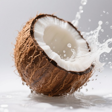 超高清摄影级别真实感,一个被劈开的新鲜椰子,外壳呈棕褐色带有天然纹理,内部白色椰肉质地细腻,椰子水从椰壳中飞溅而出形成动态的白色水花,水珠晶莹剔透,整体光影立体感强,光源来自上方形成自然的高光与阴影,背景为纯白色,突出椰子的自然质感与水花的动态效果,画面清晰锐利,细节丰富,色彩还原真实自然。