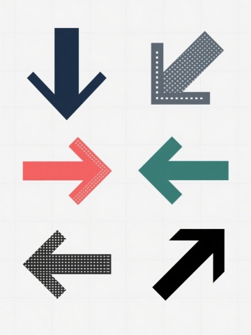 六个完全不同风格、不同造型的箭头图标系列素材集合,规整排布,每个箭头均为纯色背景,包含以下风格:1. 扁平化风格,简约线条,蓝色,直角箭头;2. 渐变风格,紫色到粉色渐变,圆角箭头;3. 3D立体风格,黄色,带有阴影效果的箭头;4. 手绘风格,橙色,线条略带不规则的箭头;5. 像素风格,绿色,8位像素感的箭头;6. 几何装饰风格,红色,箭头边缘带有三角形装饰,所有箭头保持指向右侧的核心元素内容,整体色彩丰富多样,布局整齐有序。