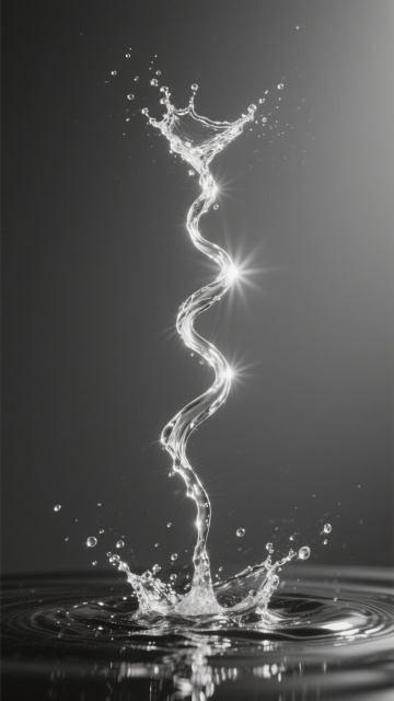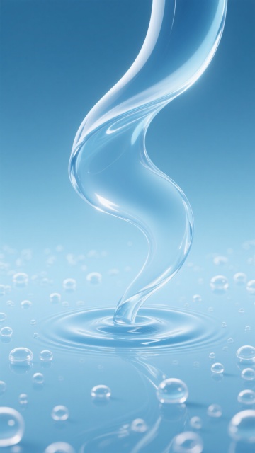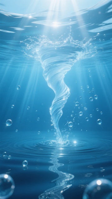 超写实摄影风格,清澈见底的蓝色水域,水面与水下清晰分层,水下部分为渐变的深海蓝色,水面上有柔和的波纹与光线反射。画面中央是一个正在向上喷涌并冻结在瞬间的水形态,呈现出冰雕般的锐利边缘与透明质感,水的形态改为向上喷射的水柱而非滴落的水花,水柱顶部绽开成类似花朵的放射状结构,周围环绕着大小不一、晶莹剔透的水泡和飞溅的水珠,水珠表面有细腻的高光和内部折射效果,整体光影柔和,光源来自上方,营造出宁静而富有张力的氛围,突出水的流动性与凝固瞬间的美感,无任何文字或标识元素。