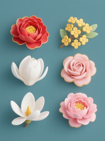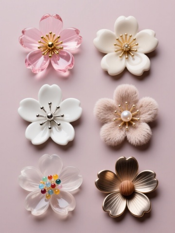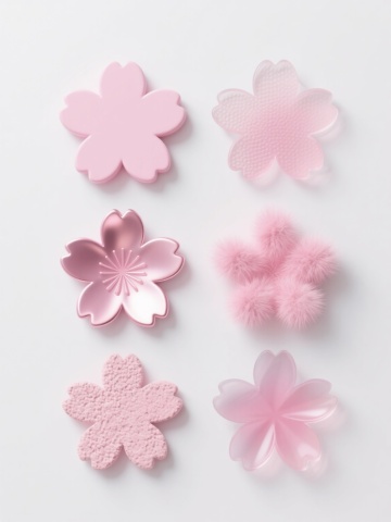 一张纯色背景的图片,画面中规整排布着6个完全不同材质的同元素、同造型的系列樱花素材集合。每个樱花都保持着原有的五片花瓣、花蕊等元素内容,但变换了元素造型和画面整体色彩。第一个樱花是水晶材质,呈现出透明的蓝色,花瓣上有细腻的光泽和折射效果;第二个是木质材质,为温暖的棕色,表面有自然的木纹肌理;第三个是金属材质,闪耀着银色的光芒,具有金属的冷硬质感和反光;第四个是毛绒材质,粉色的花瓣柔软蓬松,带着可爱的绒毛感;第五个是陶瓷材质,为优雅的白色,表面光滑细腻,有陶瓷特有的温润光泽;第六个是玻璃材质,呈现出紫色,晶莹剔透,有玻璃的通透感和光影效果。整体构图规整,每个樱花之间排列整齐,形成一个和谐的系列素材集合。