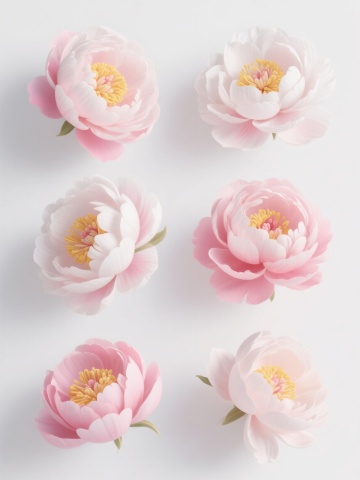 一套6张的系列素材集合,每张素材均为规整排布的单一花瓣造型图案,花朵包含郁金香花瓣、桂花花瓣、玫瑰花花瓣、白玉兰花瓣、樱花花瓣、芍药花瓣基本元素内容,整体造型简约现代,采用纯色背景,花瓣呈现出柔和的粉色,花蕊为黄色,具有细腻的纹理和自然的形态,光线柔和,色彩明亮,画面干净整洁,具有良好的视觉层次感和信息传达效率。