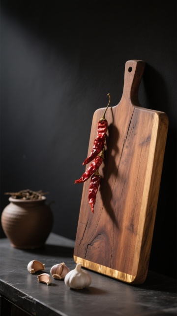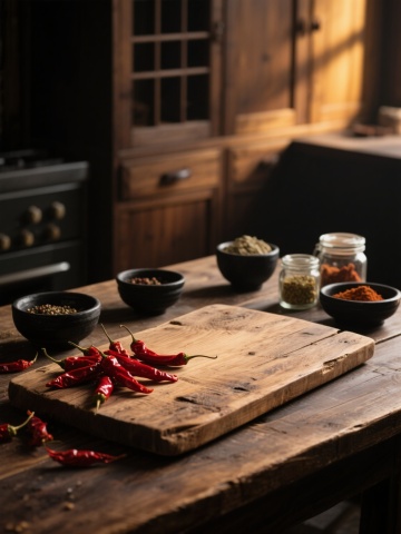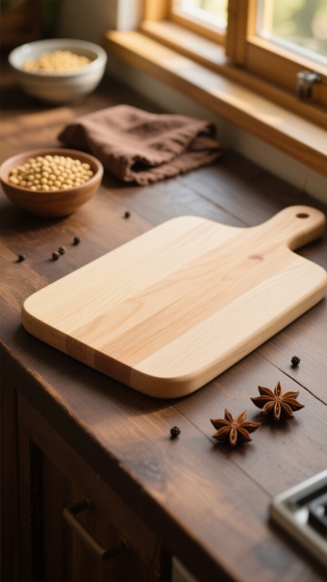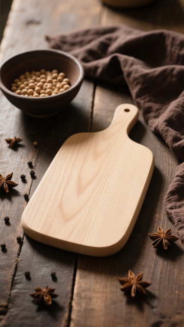 一张木纹清晰的浅色木质砧板平放在深色木质桌面上,砧板周围散落着几颗黑色胡椒粒和几片八角,背景是温馨的厨房环境,有挂着的厨具和朦胧的暖黄色灯光,整体呈现出真实细腻的食物摄影风格,暖棕色为主色调,光线柔和自然,阴影细节丰富,营造出舒适宁静的烹饪氛围。
