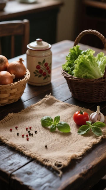 一张具有复古乡村风格的餐桌背景图,画面中心是一块粗糙质感的亚麻色粗麻布餐垫,边缘自然毛躁,随意铺陈在深色木质桌面上,木纹清晰可见。餐垫上散落着几颗红黑相间的胡椒粒和几片翠绿的罗勒叶,增添自然气息。背景中,左侧有一个装满棕色洋葱的浅木色编织篮子,旁边立着一个带有红色浆果花纹的陶瓷储物罐,罐身古朴。右侧是一个装满新鲜绿色生菜的深棕色藤编篮子,底部边缘点缀着一颗鲜红的小番茄、几瓣大蒜和几片罗勒叶,整体色调以棕褐色、原木色、绿色和红色为主,营造出温馨、质朴、充满生活气息的厨房氛围。光线柔和,从上方偏左位置洒落,在餐垫和食材上形成自然的光影过渡,阴影细腻,突出物体的立体感和材质纹理,构图采用近景聚焦餐垫,远景模糊处理背景元素,形成舒适的视觉层次,适合作为餐桌背景使用。