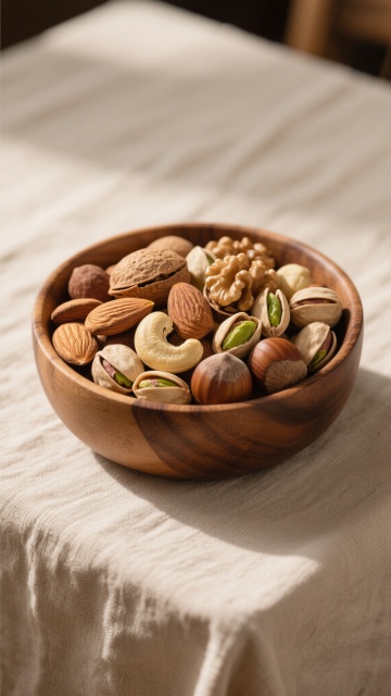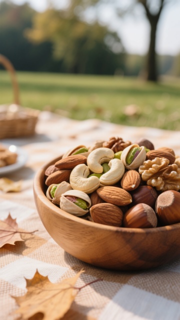 各种色彩鲜艳的零食整齐排列,从上到下依次为浅棕色的腰果、深棕色的碧根果、浅米色的花生、绿色的猕猴桃干、深棕色的椰枣、黄色的芒果干、红色的樱桃干、橙色的杏干、多彩的混合果干以及浅黄色的葡萄干,所有零食紧密平铺,形成丰富的视觉层次,整体呈现出真实、饱满的质感,色彩鲜明且自然和谐,营造出一种丰盛诱人的氛围。