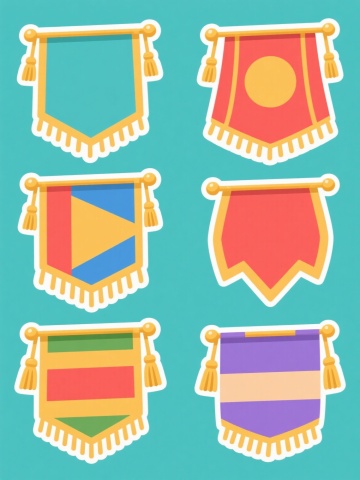 3D渲染风格的道旗设计展示图,浅色背景,上下两行对齐排列共六个道旗造型,每个道旗拥有独特的配色方案、样式设计和材质表现。道旗主体为垂直长方形旗帜,搭配金属质感黑色旗杆和圆形底座,旗杆顶部有小圆球装饰。第一行从左到右分别为:深蓝色哑光布料道旗,旗帜边缘有白色细条纹装饰;橙红色高光缎面道旗,旗帜中央有简约几何图案;浅绿色磨砂塑料质感道旗,四角有圆角处理。第二行从左到右分别为:淡紫色透明亚克力材质道旗,带有细微磨砂纹理;米黄色亚麻布道旗,表面有自然布纹肌理;浅灰色反光金属质感道旗,边缘有抛光处理。整体设计简洁现代,光影柔和,物体边缘清晰,具有产品展示图的专业感和真实质感,无任何文字、LOGO、二维码及电话地址等元素。