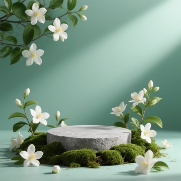 一张3D渲染风格的展示场景,画面中心是一块灰色的圆形展台,展台表面有自然的石质纹理,周围覆盖着鲜绿色的苔藓,苔藓上点缀着白色的茉莉花,有的完全绽放,露出黄色的花蕊,有的含苞待放。画面整体采用夏日主题配色,以清爽的薄荷绿为背景色,搭配白色的茉莉花和绿色的枝叶,营造出清新自然、宁静舒适的夏日氛围。光线柔和,从上方均匀照射下来,在展台和植物上形成淡淡的阴影,增强了画面的立体感和层次感。构图上,展台位于画面正中央,周围的茉莉花和枝叶以自然的形态分布,前景有几朵盛开的茉莉花作为点缀,背景简洁干净,突出展台的主体地位。