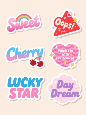 一张浅色背景的贴纸设计图,上面有6个不同配色、不同样式、不同纸张材质感的贴纸元素,呈规律排列。每个贴纸都有独特的手写风格字体和卡通装饰图案:如粉色渐变的“Sweet”字样带有圆润笔触,红色三角形边框内的“Oops!”带有彩虹色描边,红色“Shining”字样周围有星星和圆圈装饰,粉色波浪纹背景的“Stay Wild”,蓝色和粉色渐变的“Cherry”字样旁有两个卡通樱桃图案,粉色心形背景的“Palpitate With Excitement”,蓝粉撞色的“LUCKY STAR”带有星形点缀,以及带有云朵装饰的粉紫色“DayDream”。整体风格甜美可爱,充满少女心,字体设计活泼俏皮,色彩明快柔和,贴纸边缘有轻微的阴影效果,营造出立体感和纸张质感。