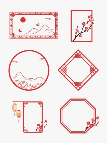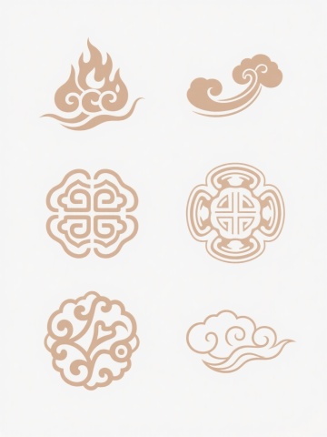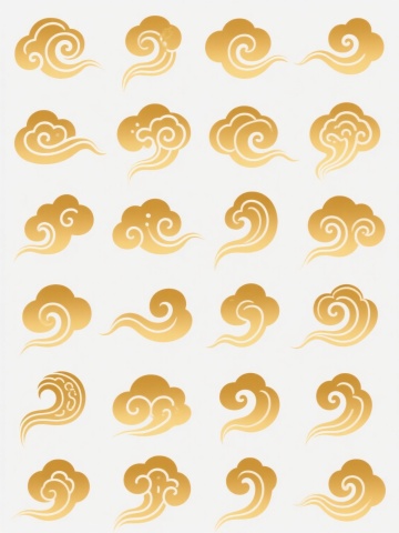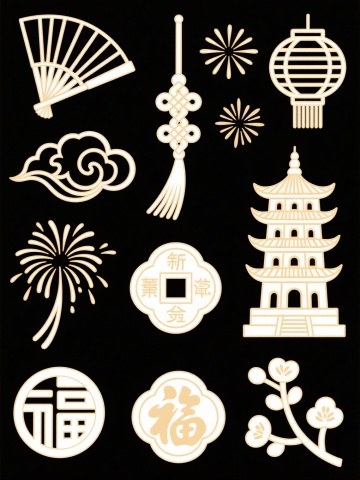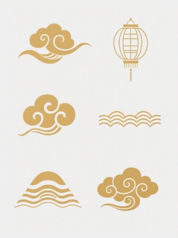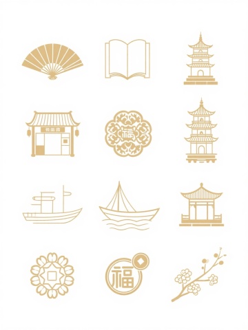 一组中国传统金色线条风格的装饰图案,包含扇形、灯笼、中国结、祥云、烟花、宝塔、古钱币、福字纹和梅花等元素,线条纤细流畅,呈浅金色,图案排列整齐,背景为纯白色,整体呈现简洁典雅的传统中国风设计感。