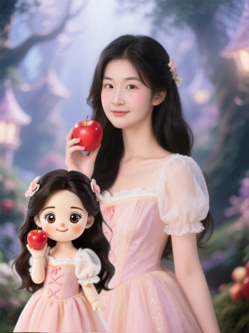 在童话世界里,女孩身着公主的衣服,手里拿一个红苹果,正面人像,高清人像摄影,虚实结合,画面氛围渲染