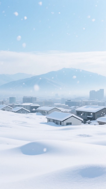 一张具有超写实摄影风格的冬季雪景城市海报,画面主体为近景细腻的白雪覆盖的地面,雪的质感呈现出蓬松、带有细微冰晶反光的特征,阳光从画面上方柔和洒下,形成明亮的高光区域和淡淡的蓝色阴影,营造出清冷而宁静的氛围。远景是被白雪覆盖的连绵山脉轮廓,天空呈现出清澈的浅蓝色并带有少量白色云彩。在保持整体色调(以纯净的白色和浅蓝色为主)和光影效果(柔和顶光、清晰的明暗过渡)的基础上,融入城市元素:画面中景处有被积雪覆盖的现代城市建筑群剪影,屋顶和建筑边缘堆积着厚实的白雪,部分建筑窗户透出温暖的黄色灯光,与冷色调的雪景形成对比。同时,天空中飘洒着轻盈的雪花,雪花形态清晰可见,部分雪花落在前景的雪地上和建筑上,增强冬季氛围。整体构图采用近实远虚的景深效果,视觉焦点集中在前景的雪地纹理和中景的城市建筑轮廓上,传达出冬日城市的静谧与祥和之美,信息传达简洁明了,符合冬季主题宣传的设计感。