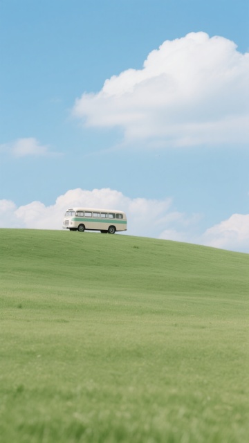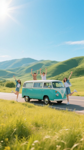 一群年轻朋友在开阔的自然风景中与复古旅行车互动的活力场景,写实风格摄影,明亮通透的光线,天空呈现清澈的渐变蓝色,地面是绿色草地和远处的山丘,复古绿色旅行车停在画面中央,朋友们穿着休闲夏装,有的站在车旁、有的从车门探身、有的单脚踩在踏板上,所有人都举起手臂做出欢快的姿势,脸上洋溢着灿烂笑容,整体氛围轻松愉悦充满青春气息,展现不同的旅游出行方式,画面构图饱满,色彩清新自然,人物姿态生动富有动感,远处的自然景观与前景的人物车辆形成和谐的空间层次。