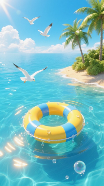 夏日泳池水面俯视图,蓝色网格状瓷砖池底,清澈池水中漂浮着粉白相间的救生圈、黄色带绳救生圈和黄色浮球,边缘点缀绿色棕榈叶,水波荡漾形成白色涟漪,整体呈现明亮欢快的卡通插画风格,色彩清新明快,光影柔和,营造出轻松愉悦的夏日氛围。