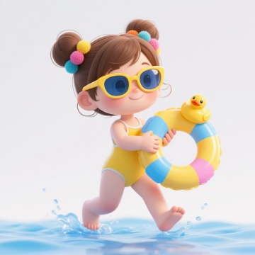 一系列4个不同内容的3D卡通风格儿童夏日活动插画,保持低多边形圆润造型、明亮柔和光影、高饱和度色彩和光滑材质质感,每个元素独立置于纯色背景上并规整排布;第一个画面:穿着黄色条纹上衣和蓝色短裤的男孩戴着橙色泳镜,躺在蓝白相间的游泳圈上开怀大笑,双手举起泳镜,双腿自然伸直;第二个画面:穿着粉色连衣裙的小女孩戴着粉色蝴蝶结发箍,坐在黄色充气鸭子游泳圈里,手里拿着一个红色草莓冰淇淋,面带微笑看向一侧;第三个画面:穿着绿色短袖和白色沙滩裤的小男孩戴着蓝色太阳帽,站在紫色冲浪板旁,手里拿着黄色沙滩铲,脚下踩着白色沙滩,表情兴奋;第四个画面:穿着橙色泳衣的小女孩戴着紫色浮袖,坐在粉色充气独角兽游泳圈上,手里拿着一个黄色小水桶,水面上漂浮着蓝色小鸭子玩具,笑容灿烂。