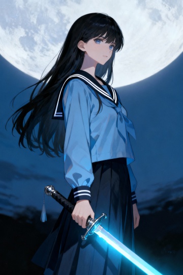侧视构图,在一座被月光浸透的古老神社鸟居下,一位身着改良巫女服的少女正跪坐在漂浮的和纸灯笼上,她的银白色短发上系着朱红色的发带,几缕发丝被夜风吹起,发间别着一朵半开的黑色山茶。巫女服以墨色为底,领口和袖口绣着渐变的荧光蓝蝴蝶纹样,腰间系着深红色的蝴蝶结,裙摆下露出一截白皙的小腿和木屐。她的手中握着一支正在滴落星光的毛笔,笔尖触及之处,水面上便绽放出淡蓝色的符文涟漪。周围环绕着十二只形态各异的狐狸式神,有的通体雪白,有的毛色漆黑,眼睛都散发着幽幽的蓝光。背景是被薄雾笼罩的日式庭院,石灯笼散发着温暖的橙光,远处是连绵的黑色山峦轮廓和一轮巨大的血月,水面漂浮着散落的樱花花瓣和燃烧的线香灰烬,色调是神秘的靛蓝与朱砂红的交织,光影在巫女服的丝绸面料上形成柔和的漫反射。
