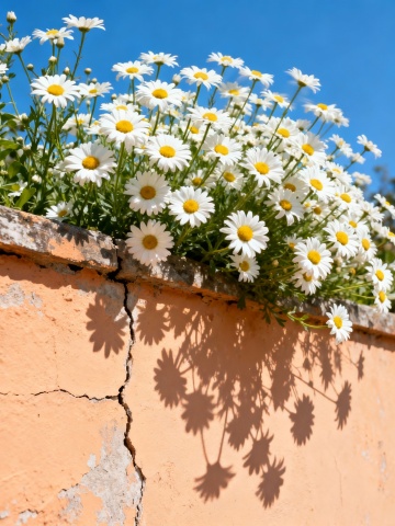 一张向日葵特写的摄影照片,画面中央是一朵巨大的、盛开的向日葵,花瓣呈现明亮的黄色,中心是深棕色的花盘,周围环绕着多朵大小不一的向日葵,绿色的茎秆和叶片清晰可见,背景改为一片古朴的欧式石墙庭院,午后的阳光从斜上方照射下来,在花瓣上形成明亮的高光和自然的阴影,天空呈现出清澈的蓝色,点缀着几朵白色的云朵,整体画面色彩鲜艳、清晰锐利,充满生机与温暖的氛围。