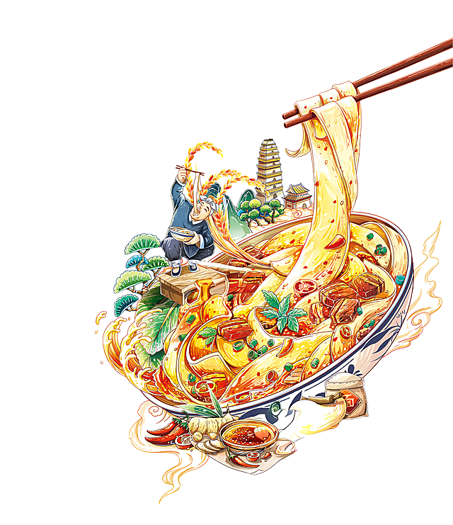 巨大的一碗面条作为主视觉,两边有一些盘子,山水,河流,码头,茶田作为背景,四周摆摊有一些陕西菜品,蓝天白云。详情