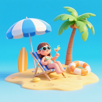 3D风格卡通小女孩,白色背景,棕色头发扎成双丸子头并装饰彩色毛球,戴着黄色镜框蓝色镜片的太阳镜,身穿黄色连体泳衣,双手握着一个黄色为主、带有粉色和蓝色部分的充气游泳圈,游泳圈上有小黄鸭装饰,小女孩双腿微微弯曲,身体略微侧转,一只脚轻轻踩在蓝色水花上,展现出活泼戏水的动态,整体色彩明快鲜亮,光影柔和,具有可爱的Q版人物特征和光滑的3D材质质感。