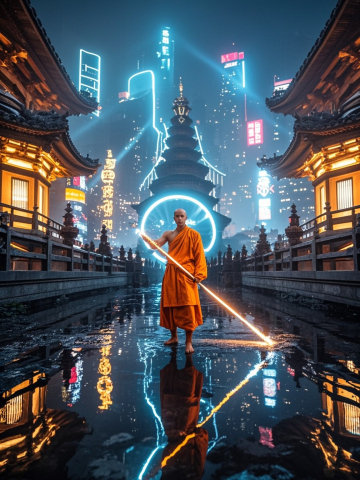 未来寺庙禅院,一个武僧身着橙色僧袍,手持发光能量棍,静立水面上倒映霓虹城市,东方科幻