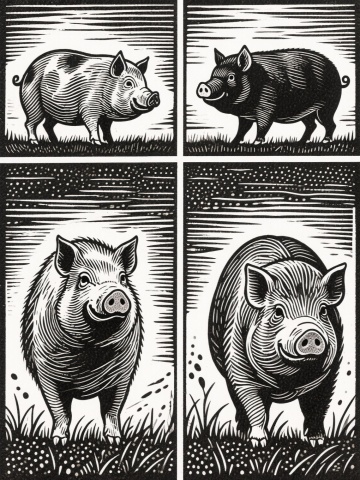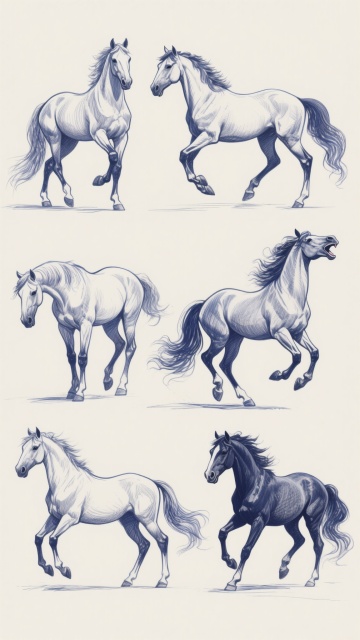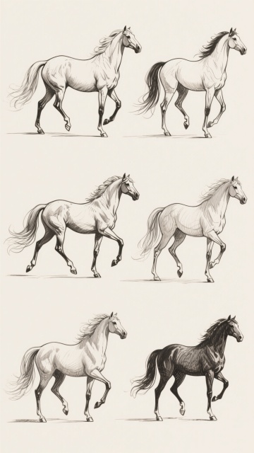 黑白手绘素描风格,6个不同配色、不同样式、不同材质的「牛」造型,保持原图中牛的站立姿态、头部微低、口中含草、四肢结构及草丛细节的素描笔触质感,线条粗细变化自然,明暗对比通过交叉排线表现,浅色背景,上下两行各三头牛整齐对齐排列,整体构图平衡,每个牛造型各具特色,维持统一的手绘素描艺术风格。
