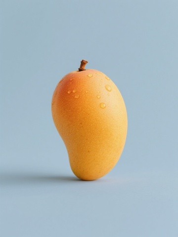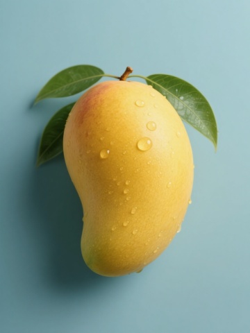 超写实风格,明亮的黄色芒果,表面带有晶莹水珠,绿色叶子,简约现代设计,纯白纯色背景,规整排布的单一芒果元素图案,无文字,无logo,无水印,高清细节,光影自然,水果质感,系列素材集合中的一张