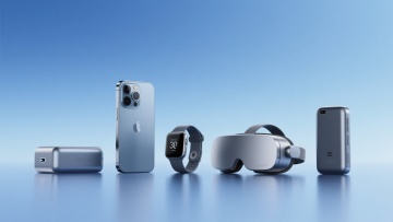 一张智能手机的产品展示渲染图,手机以略微倾斜的角度放置在纯白色背景上,银色金属边框,正面屏幕显示深邃的渐变色彩,上方是明亮的蓝色渐变圆形图案,下方是从深黑过渡到淡粉色的渐变圆形图案,整体呈现出极简、科技感、高端、清晰、光滑的3D渲染风格,光影效果柔和,突出手机的轻薄机身和流畅线条。