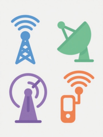 一套四个不同元素内容的系列素材集合,每个元素均采用简约扁平风格设计,线条圆润流畅,色块分明无渐变,配以轻微阴影增强立体感,背景为纯色(每个元素可使用不同的柔和纯色背景以区分),元素周围点缀少量黄色小星星和浅蓝色波浪线条作为统一装饰;四个元素规整排布于同一画面,呈2x2网格布局,彼此间距均匀,整体构图平衡对称。第一个元素为蓝色卫星天线,底座为深蓝色,支架为浅蓝色,碟形天线呈半透明浅蓝色,周围有信号波纹;第二个元素为绿色Wi-Fi路由器,主体为浅绿色长方体,顶部有三根白色天线,正面有若干小圆点指示灯,周围有Wi-Fi信号波纹;第三个元素为橙色智能手机,屏幕为深蓝色,机身侧面有按键,顶部有信号图标和电池图标,屏幕上可显示简单的信号格图案;第四个元素为紫色蓝牙耳机,左右耳机通过弧线连接,耳机外壳有圆形触控区域,耳机下方有充电盒,充电盒上有指示灯,周围有蓝牙连接符号。所有元素下方均无文字,保持视觉简洁统一。