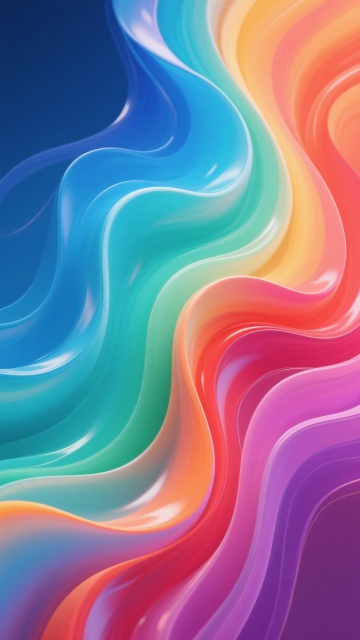 一张充满流动感的彩色背景设计,整体呈现出现代抽象的3D流体艺术风格。画面中,多种饱和明亮的色彩——深邃的靛蓝、纯净的天蓝、清新的薄荷绿、温暖的橙红、活力的粉红以及明亮的黄色——相互交融、渐变过渡,如同液态丝绸般自由流淌。色彩的分布自然且富有层次感,从左上角的深蓝紫色系,向右下方逐渐过渡到橙红色系,并在中央区域形成蓝绿与橙黄的柔和交汇。流体形态呈现出柔和的波浪状曲线和有机的漩涡结构,边缘平滑模糊,内部色彩过渡细腻自然,仿佛有轻微的动感和韵律。光影效果柔和,高光区域主要集中在色彩交汇的边缘和流体的隆起部分,产生微妙的光泽感,阴影则自然地融入色彩较深的褶皱之中,增强了整体的立体感和空间深度。整个背景充满了欢快、活力与梦幻的氛围,色彩搭配和谐且具有强烈的视觉冲击力,构图饱满均衡,没有任何文字或具象元素干扰,纯粹以色彩和形态传达出自由流动的美感。