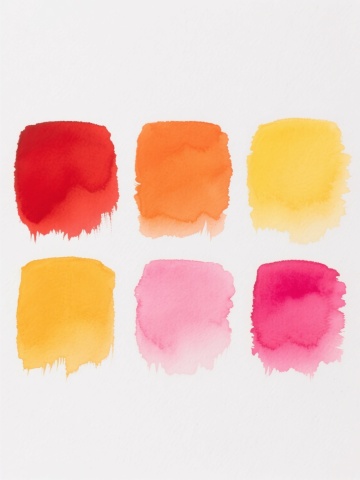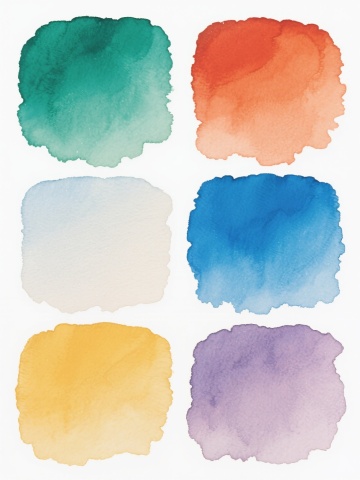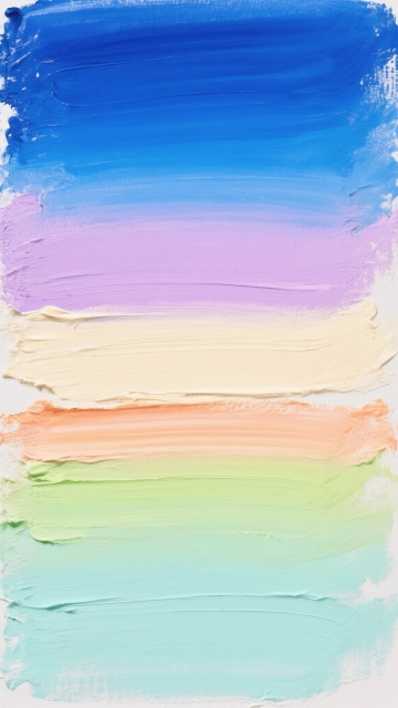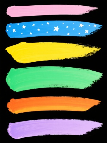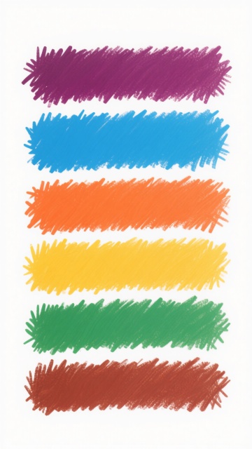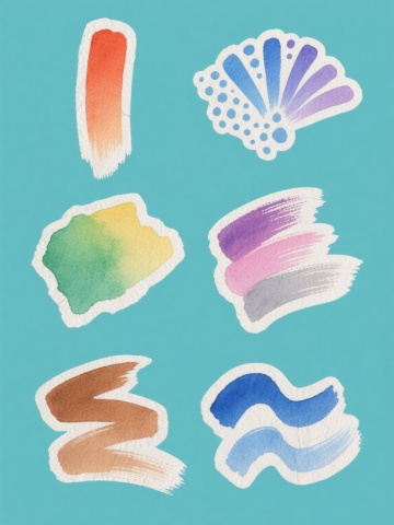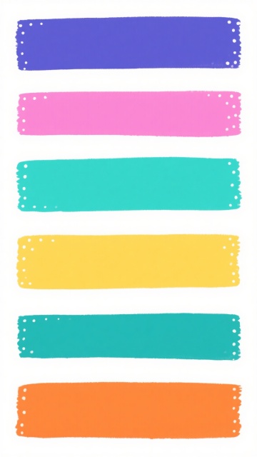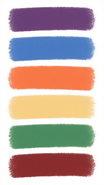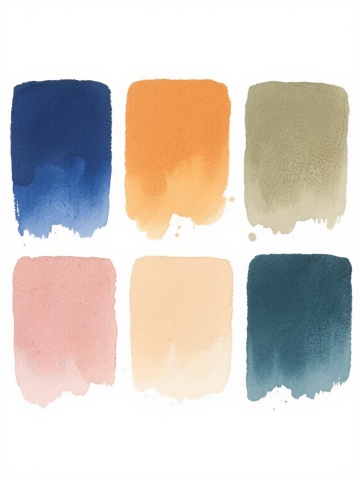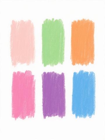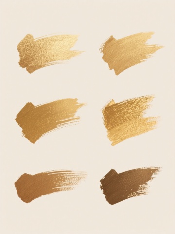 浅米色背景上,以规律网格排列六个不同配色、样式和笔触的笔刷元素。每个笔刷具有类似原图的干刷质感,边缘带有自然的飞白和不规则笔触,呈现出油画般的厚重纹理。第一个笔刷为暖金色渐变,第二个为深蓝色带紫色调,第三个为草绿色带黄色渐变,第四个为珊瑚粉色,第五个为天蓝色带白色高光,第六个为赭石棕色。所有笔刷保持统一的干纹理油画风格,大小相近,间距均匀,整体构图平衡且具有视觉节奏感。