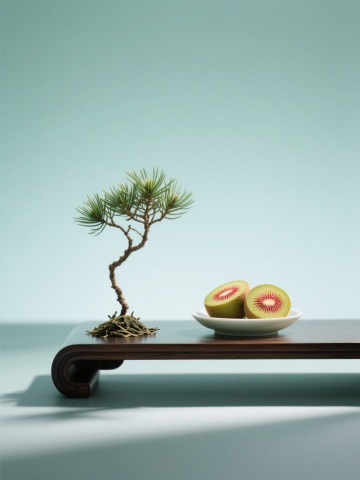 清新中式风格,简约主义设计,绿植与奇异果相映成趣,营造自然雅致氛围。