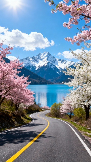 一条蜿蜒的沥青公路,路面上画着两条醒目的黄色分隔线,公路两旁是茂密的森林,有高大的松树和一些低矮的灌木。远处是雄伟的雪山,山顶覆盖着皑皑白雪,在阳光的照射下,雪山呈现出金黄色和橙色的光辉。天空湛蓝,飘着几朵淡淡的云彩,营造出一种宁静而壮丽的自然景观氛围。