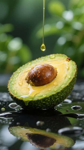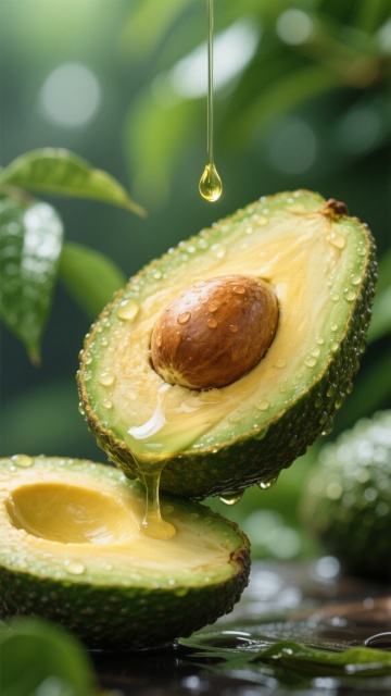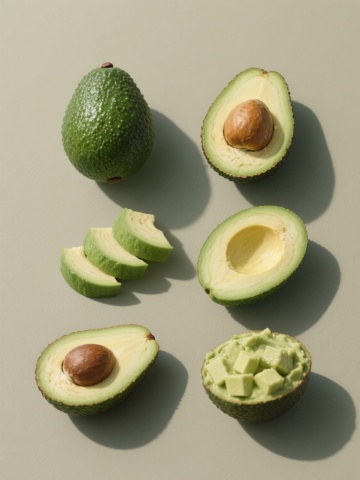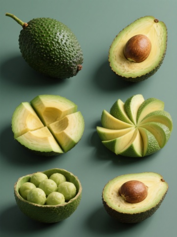 俯视角构图,大量不同角度的牛油果密集排列,包括完整带纹理的深绿色牛油果、对半切开露出浅绿色果肉与棕色果核的牛油果,部分切面点缀水珠,穿插深绿色牛油果叶片,整体呈现高清晰度的写实摄影风格,暗黑色背景突出牛油果的鲜亮色彩,光线从上方照射形成明显的高光和阴影对比,展现牛油果表皮的粗糙质感与果肉的细腻光滑,营造出新鲜、饱满、充满生机的视觉效果。
