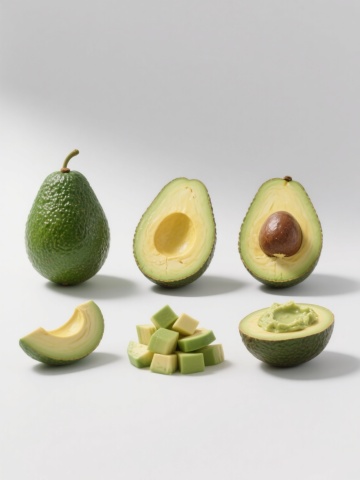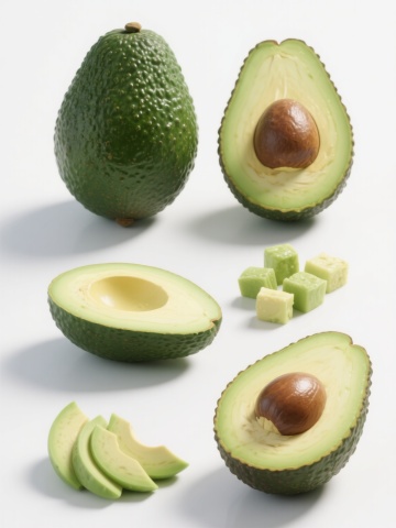 纯白色背景上,六个水果元素规整排布成系列素材集合,每个水果都以高度写实的摄影风格呈现,具有清晰的纹理细节、自然的光影过渡和高饱和度的色彩。左侧从上到下依次为:半个牛油果,果核完整,表面光滑的绿色果皮带有细密凸起,切开的果肉呈现淡黄绿色,一颗金黄色的蜂蜜滴落其上,蜂蜜具有透明的光泽和粘稠的质感;一个完整的蓝莓,深蓝色的表皮带有自然的果粉,顶部有细小的果蒂,球体饱满且富有弹性。右侧从上到下依次为:一个被切开的橙子,橙皮呈现鲜艳的橙黄色,带有明显的凹凸纹理,果肉瓣清晰可见,颗粒饱满,汁水欲滴;一个草莓,鲜红色的果实表面布满黄色的籽粒,顶部绿色的叶子呈现锯齿状,果实底部微微内凹;一个猕猴桃,被切成两半,棕色的果皮上覆盖着细密的绒毛,绿色的果肉中分布着黑色的籽粒,截面光滑;一个柠檬,一半被切开,黄色的果皮光滑且带有油点,果肉呈现淡黄色,白色的筋络清晰可见。所有水果元素保持统一的光照方向,阴影自然柔和,整体构图平衡对称,每个水果都占据相似的空间大小,共同营造出清新、健康的视觉氛围,具有强烈的设计感和信息传达效率,适合作为健康食品或饮品的宣传素材。