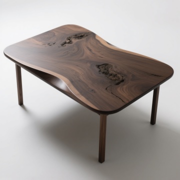 一张高质量产品展示图,白色纯净背景,主体为一张设计感十足的木质桌子。桌子采用深色实木材质,表面呈现出自然流畅的山形木纹和独特的树瘤纹理,木纹走向富有变化且清晰可见,木材质感真实细腻,带有天然的细小毛孔和轻微的打磨痕迹。桌面边缘设计为柔和的弧形圆角,桌腿为简约的细线条方形结构,与桌面形成稳固连接,整体风格简约现代。光线从左上方柔和照射,在桌面形成自然的明暗过渡,左侧边缘有轻微的高光,右侧和底部形成柔和的阴影,增强了物体的立体感和空间感。画面构图采用经典的产品摄影视角,桌子居中放置,占据画面大部分空间,底部边缘略微裁剪,突出木材的质感和纹理细节,整体给人一种高端、简约、自然的视觉感受。